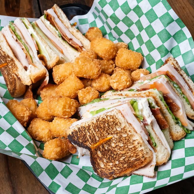 Turkey breast, romaine lettuce, tomato, bacon, & mayo on toasted white bread served with fries or tots