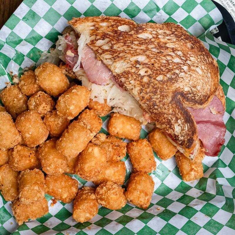 Grilled corned beef, sauerkraut, Swiss cheese, house dressing, on rye served with your choice of chips, fries or tots