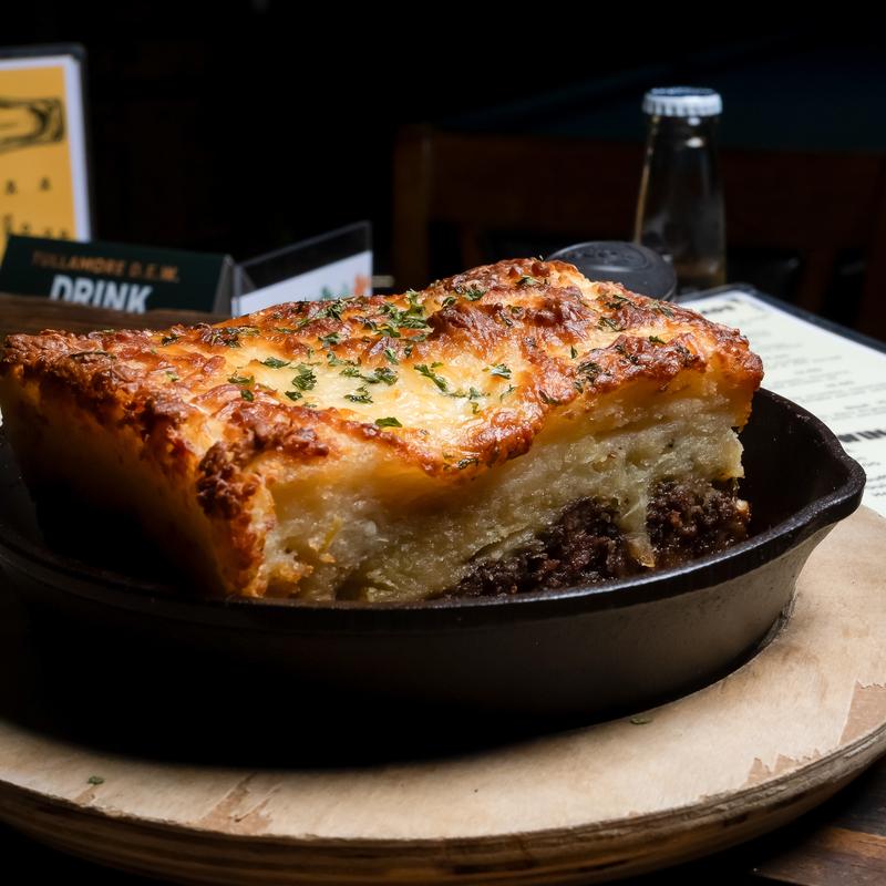 Ground beef, peas & carrots simmered with Guinness, thyme & herbs slow-cooked, topped with creamy mashed potatoes