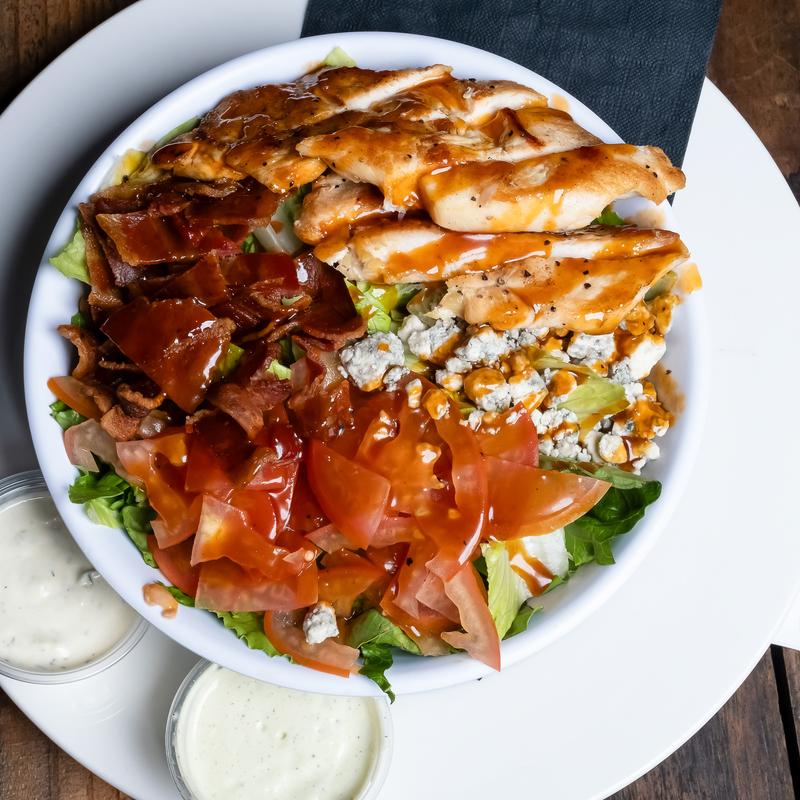 Romaine lettuce, blue cheese crumble, tomatoes, bacon, chicken, BBQ sauce drizzle served with blue cheese dressing
